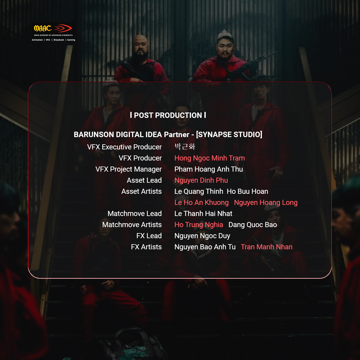 Danh sách Giảng viên & Học viên MAAC (bôi đỏ) tham gia làm VFX cho Money Heist