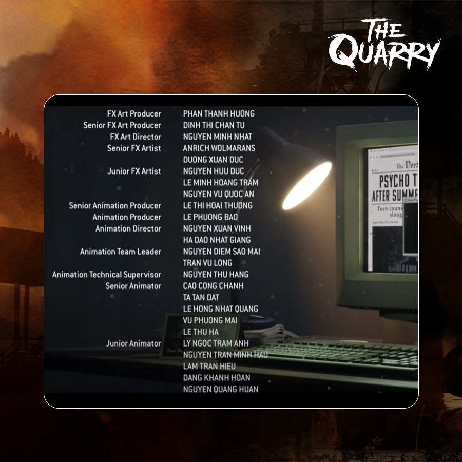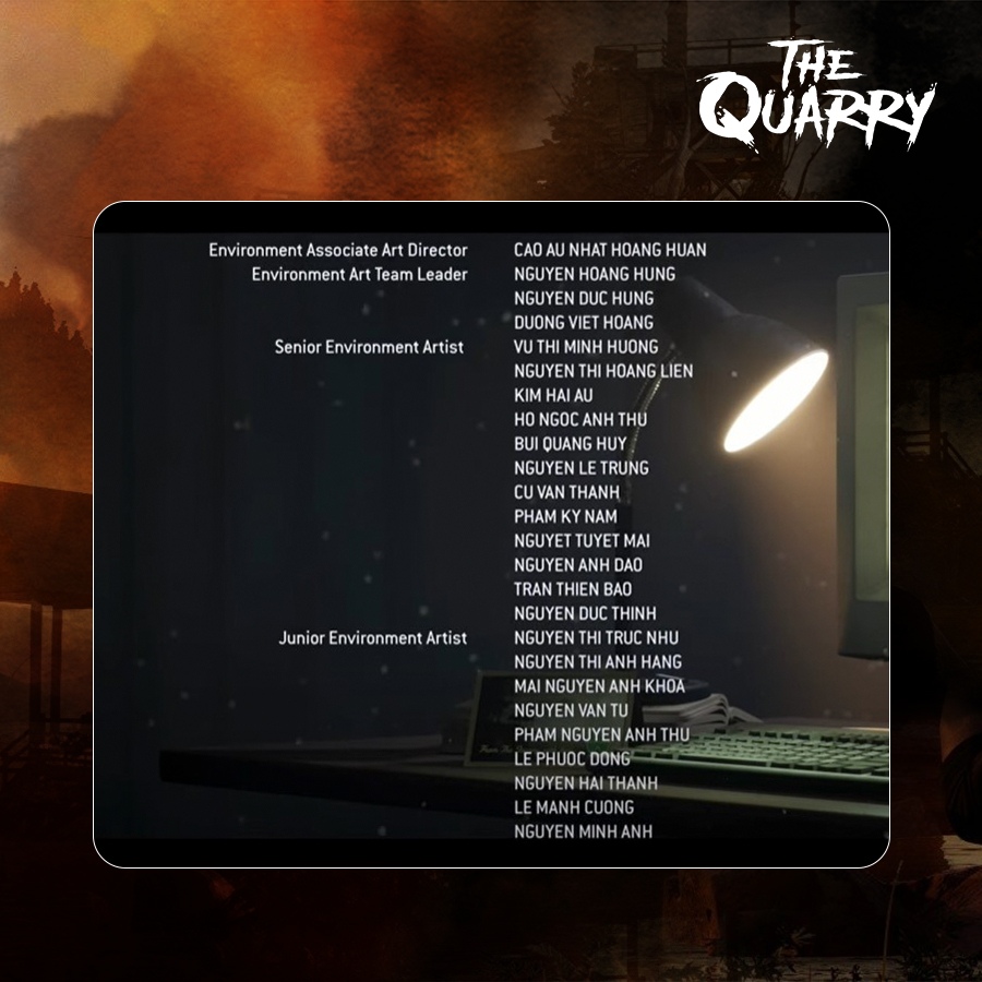 Một trong những điều đặc biệt góp phần tạo nên những màn chơi đỉnh cao trong The Quarry chính là sự tham gia của loạt Artist người Việt, đảm nhiệm nhiều vai trò quan trọng như: Concept Art, Character Art, Environment Art, Technical Art, Rigging, Animation,…